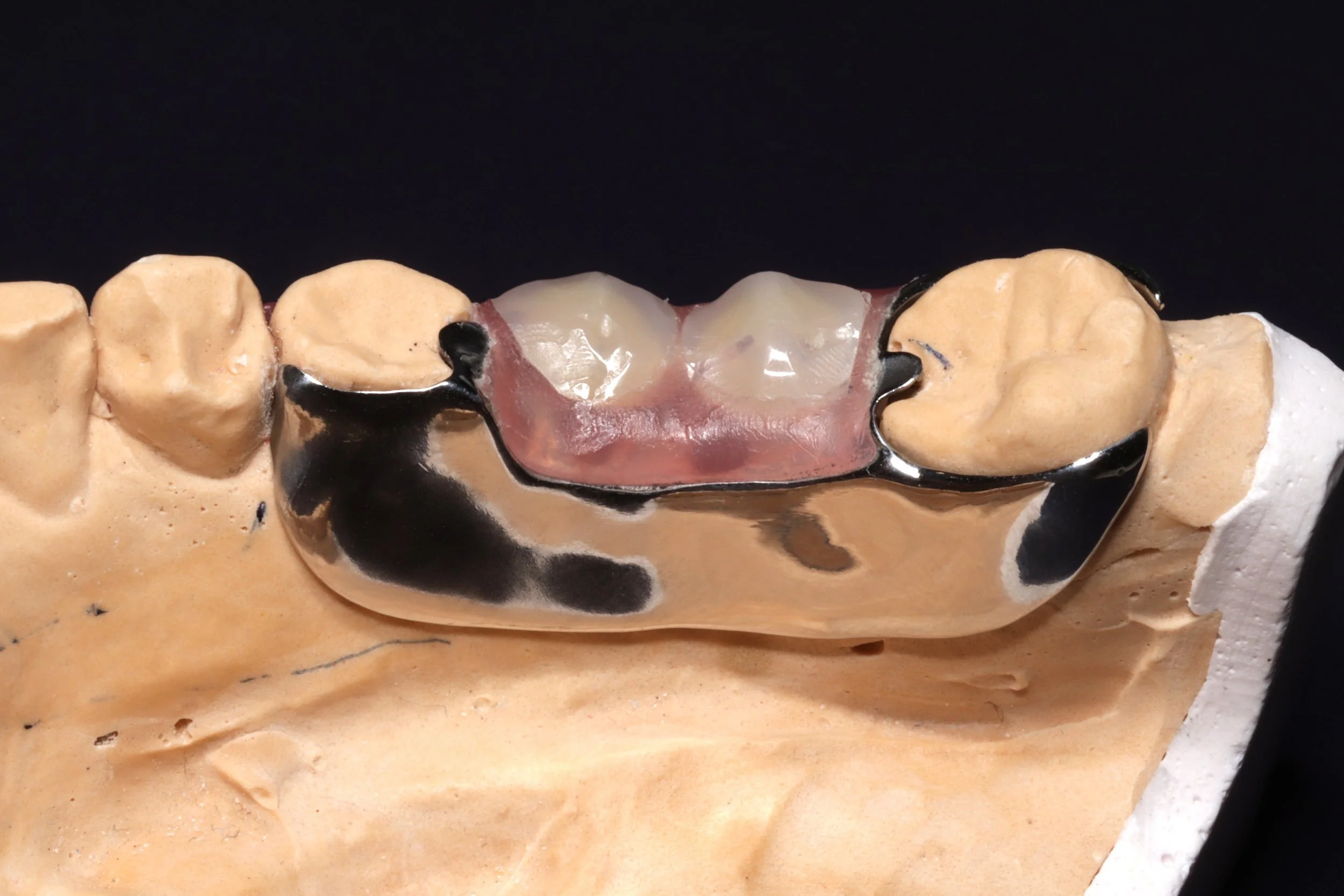内側から撮影した写真です。ちょうど金属の部分は舌にあたる部分で、違和感を軽減したいということから、エステショットだけでなく、コバルトクロムという金属を用いて薄くし、入れ歯だけど できるだけ違和感がないような設計を行っていました。