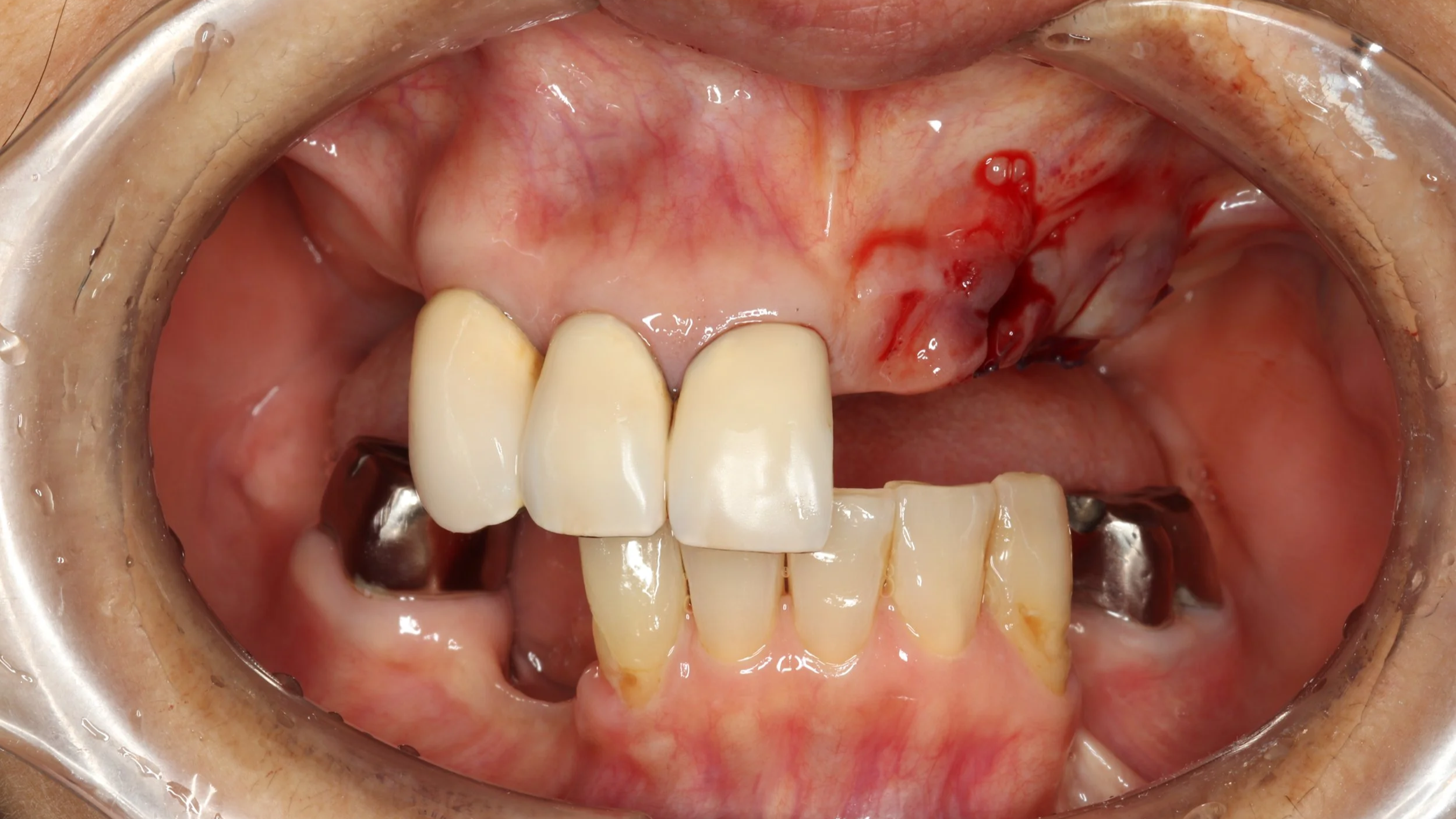 連結されている前歯を切断するとともに、折れた根の抜歯を行い、その後デジタルデンチャーを装着し機能回復を開始しました。