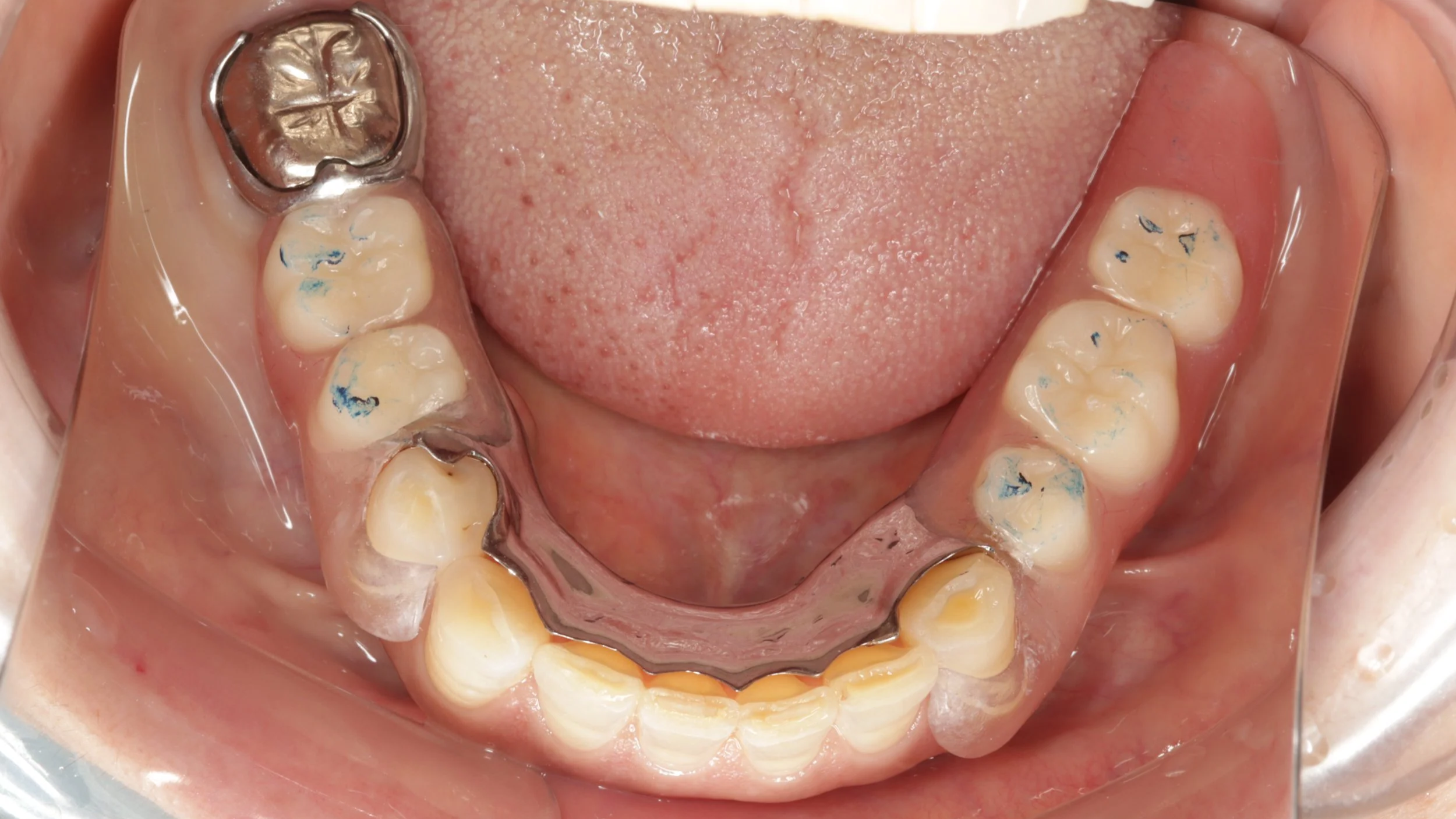 奥の歯には、金属で入れ歯を止めるバネを製作し、前歯の見える部分には、透明なレジンクラスプを使用しました。